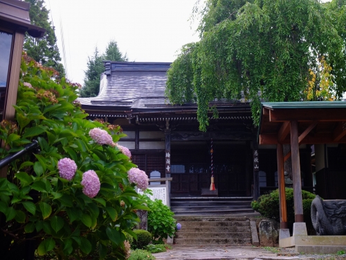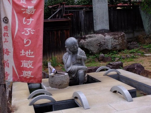 曹洞宗の古刹で、薬師堂には、本尊薬師如来と脇侍の日光・月光菩薩及び十二神将、本堂には、一茶の木像が安置されています。ここで話題なのが、境内にある湯けぶり地蔵尊。湯に浸した白布でお地蔵様の肩や腰などをさすると、温泉の持つ効用が伝わり、「ピンピン・シャンシャンになれる」と言われています。