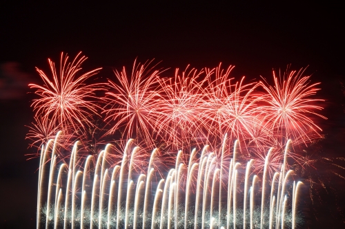 千葉県と埼玉県の県境である江戸川の広大な河川敷で開催される花火大会。会場付近の流山本町は、江戸から明治期にかけて舟運で栄えた時代の面影を残し、古民家を改装たカフェやレストランなどが並ぶ街並みも楽しめます。また、住民の手作りによる約100基の切り絵行灯があたたかい気持ちにさせてくれます。花火大会の見所は、花火と音楽がシンクロする「流山スカイミュージカル」。そのほかスターマインや連発花火、メッセージ花火など、対岸の三郷市で開催されている「みさとサマーフェスティバル」とあわせて約1万4,000発の花火が打ち上げられます。