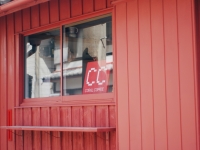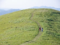 写真:トラベルライター 鬼岳の草原 |  写真:トラベルライター 鬼岳の火口 |  写真:トラベルライター 地元の子どもたちと一緒に塗ったという、さんごさんの赤いペンキの外観 |