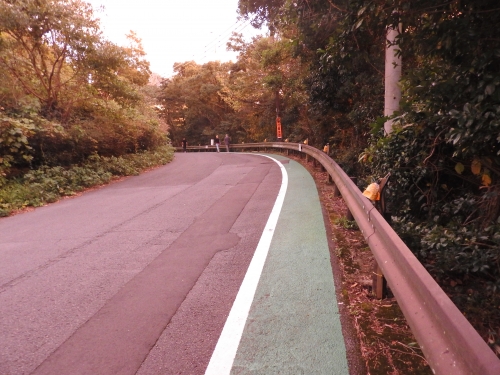 タクシーを降りたら、ゲートの横から車道に出ます。山道なので勾配はありますが、山頂まではゆっくり歩いて15分ちょっとなので、歩くのが億劫でなければ歩いて行きましょう。車の往来はほとんどありませんが、安全のため、道の端のグリーンの部分を歩きましょう。