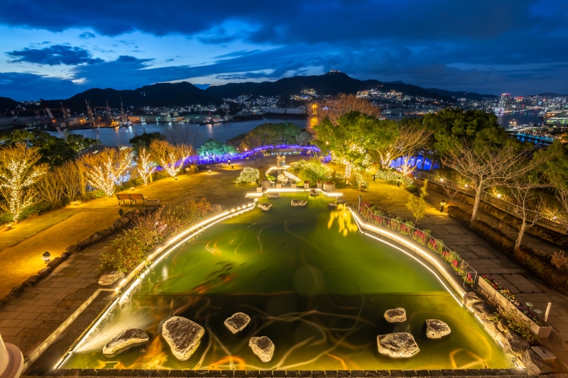 高台にあるため長崎港を一望でき、時期によっては開園時間を延長するので夜景鑑賞にももってこいのスポット。長崎といえば夜景鑑賞も旅の楽しみの一つですが、そのほかの夜景スポットと比べて景色以外も観光できる場所なので、女子一人旅でも訪れやすいでしょう。夕方ごろに訪れて、日暮れ〜夜景までの景色の移り変わりをゆっくり眺めてみては。