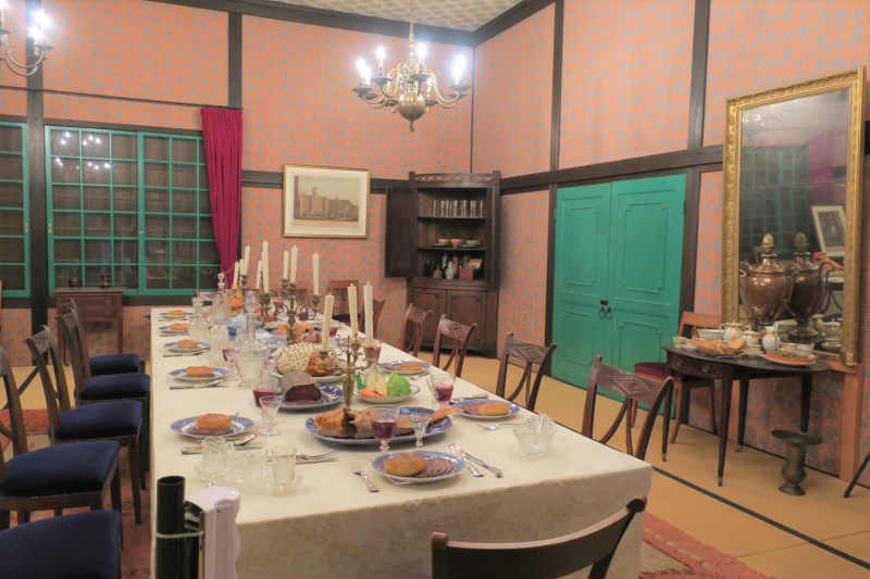 見どころのひとつが「カピタン部屋」。オランダ商館長(カピタン)や商館員たちが暮らしていた建物で、35畳の広さを誇る大広間では、牛肉やワインなどをテーブルに並べてクリスマスパーティーを行っていた様子が再現されています。