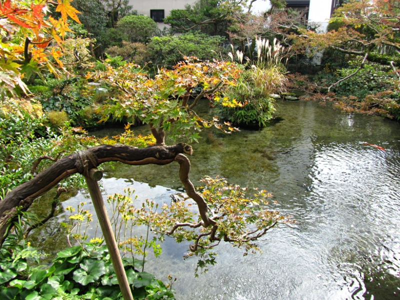 1日に約3,000トンもの湧き水が出ている日本庭園です。湧水池にせり出したかたちの縁側に座ると、足元には透明感バツグンの池を臨める、という珍しい庭園です。