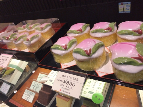 シンプルなカステラだけでなく、写真右の「桃カステラ」も売られています。カステラの上に砂糖蜜をかけ桃の形に仕上げたお菓子は、見た目も可愛く長崎土産にぴったりです。