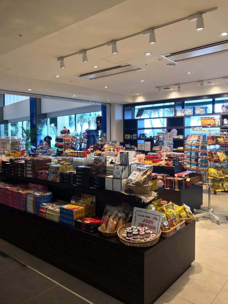 1階にあるスーベニアショップでは、シーサーをはじめとする沖縄の伝統工芸品や、バラマキにも最適なお菓子、塩などの食品の他にも、リゾートウエアーやオリオンビールなどがプリントされたTシャツや下着までと、幅広い商品がそろっています。購入した商品は自宅まで宅急便で郵送することもできるのでとても便利。値段は街中のお店と同じ価格なので、お土産探しで時間を潰す必要もないんです。