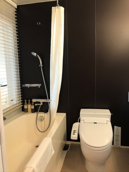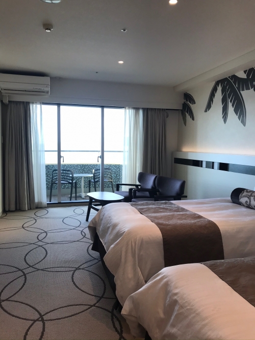 筆者が宿泊したスーペリアツインは、開放感あふれる広々とした部屋で、なんとバスルームのブラインドを開ければ、お風呂に入りながら海が見渡せるビューバスが設置されています。また、湯沸かし器や冷蔵庫、部屋着、スリッパも付いています。