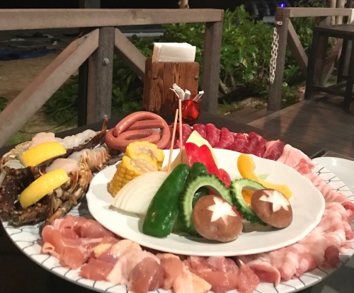1階にある居酒屋ちんぼーらは、目の前に名護湾が一望できるテラス席と、沖縄の雰囲気が漂う店内席があります。テラス席ではBBQ(¥3,800~)ができるので、沖縄のアグー豚や獲れたてのロブスターを豪快に焼いて頂きましょう。
