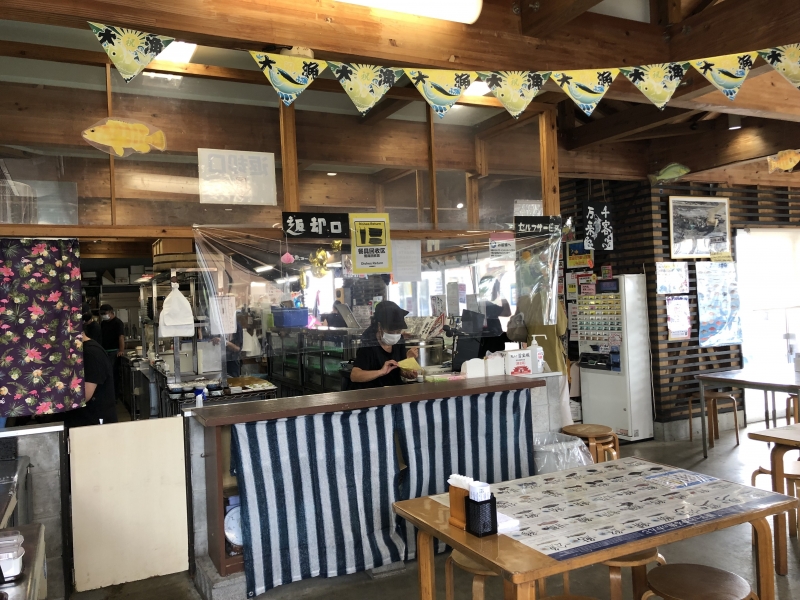 そんな名護漁港の敷地内には、漁業組合直営の「名護漁港食堂」があり、観光客にも人気!建物の看板には “食堂” とは書かれておらず「名護漁港水産物直売所」とありますが、中に食堂があります。また、看板にある通り、名護漁港で水揚げされた魚介の直売所にもなっています。