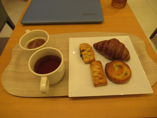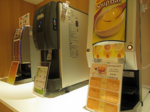 ファーストキャビンTKP名古屋駅では、AM7:00から400円で朝食の提供を行っています。パン最大5種類 + スープ1種 + ドリンクバーを館内でいただくことができるので、かなり重宝します。