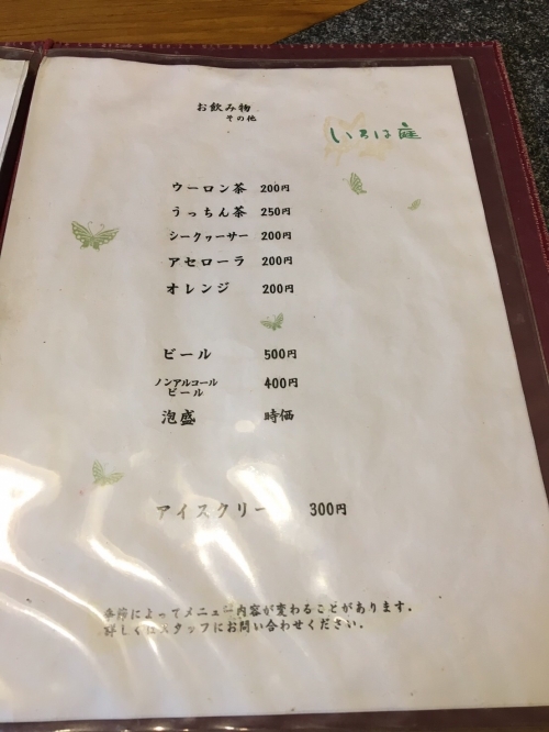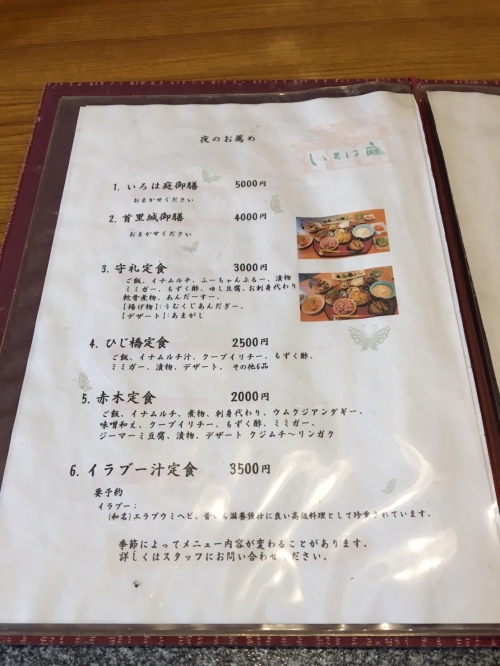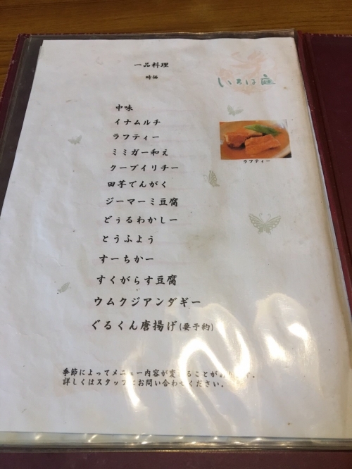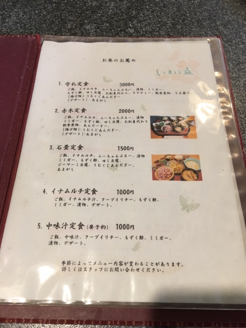さっそくお料理を選びましょう!筆者は、奥様におすすめ頂いた石畳定食(1,500円)と、うっちん茶(ウコン茶のこと/250円)を注文しました。