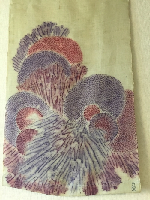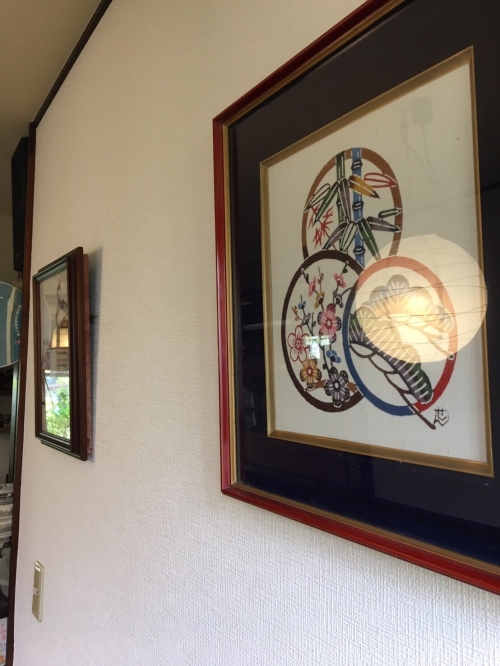 壁には、美しい色合いの琉球の染め物が飾られていました。掛け軸タイプのもの、額に入れられたものなど様々で、内装も凝っているのが特徴です。