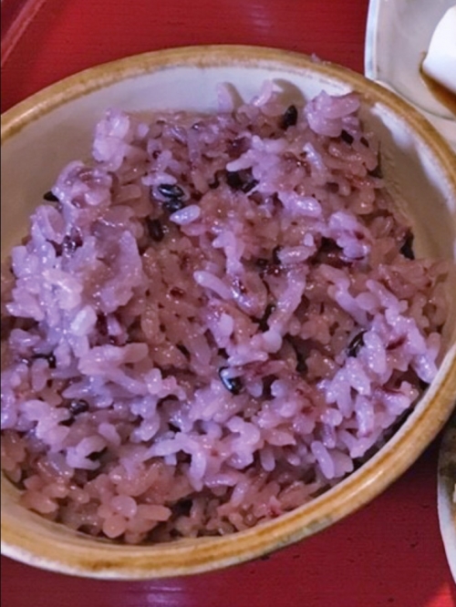 左側は、黒米入りごはんで、プチプチした歯ごたえが感じられ、彩りも美しいです。