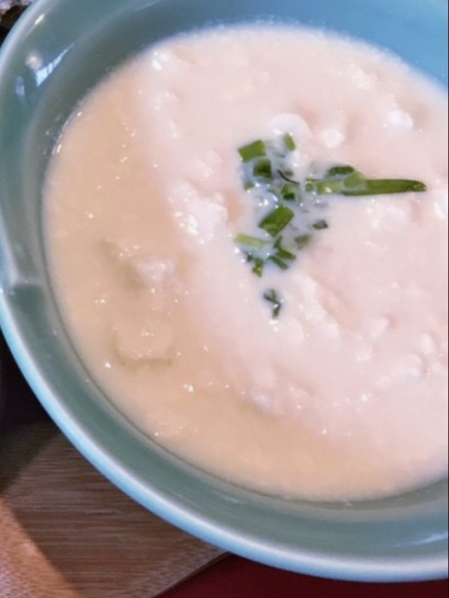 右側は、ゆし豆腐で、豆腐を固める前段階のものです。固めていない分、汁気があり、スープのように頂きます。味は割としっかりめの塩味で、トッピングには刻んだネギがのっています。