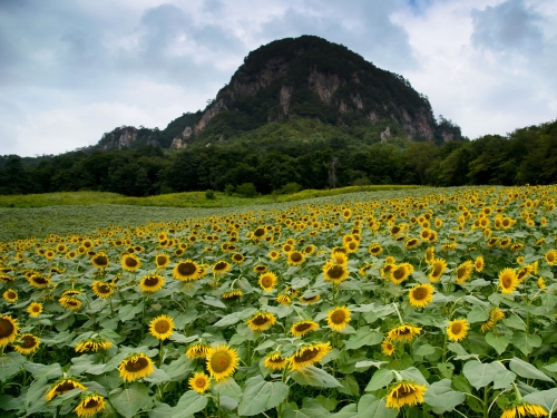 四万温泉、草津温泉などの温泉地に囲まれた、標高700メートルの大岩の麓に広がる『大岩フラワーガーデン』。春から秋にかけてさまざまな花を楽しめますが、訪れるのに特におすすめの季節は、4万平方メートルほどの敷地に約50万本のひまわりが咲き誇る、7月下旬から8月下旬にかけて。