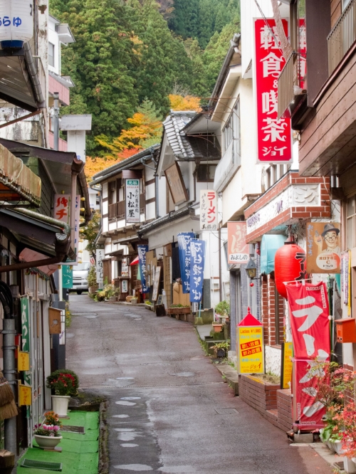新湯横丁広場のある交差点から落合橋までの短い通り。昭和の趣を感じさせるレトロなお店が約10軒ほど並んでおり、フォトジェニックと話題を呼んでいます。行列のできる人気のうなぎ店やラーメン店、蕎麦店などもあるので、食事がてら立ち寄ってみるのもおすすめです。