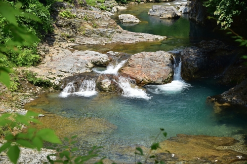 小さな滝ですが、コバルトブルーの滝壺が幻想的で、SNSでじわじわと人気が出ている滝です。案内板が出ており滝の近くまで降りて行くことができますが、ぬかるみなど滑りやすいので、滑りにくい靴でお出かけください。キャニオニングのゴール地点にもなっています。