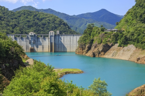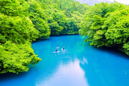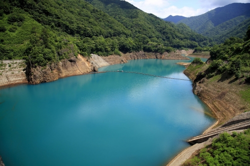 四万湖からさらに車で15分ほど進み四万温泉を通り過ぎると、その先に、四万湖よりもさらに大きな奥四万湖があります。四万川ダムを構成しているダム湖で、コバルトブルーとは一言で言い表せないような美しい青が広がります。日や時間によって深い青、明るい青など、様々な青へと表情を変えます。
