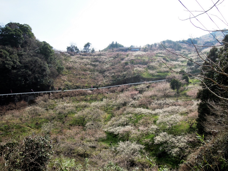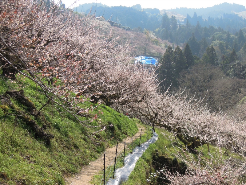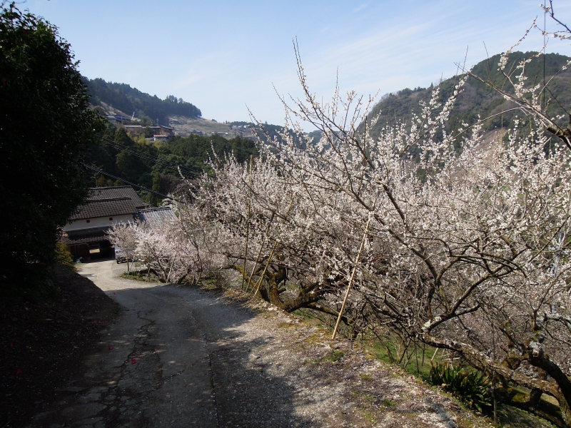 軽乗用車がやっと通れるぐらいの道が、梅林内の民家を結んでいます。急な斜面に古くからの民家が点在している景色は、都会の人には新鮮に感じられるのではないでしょうか。このような場所にも梅の木がずっと植えられており、とても見ごたえがあります。