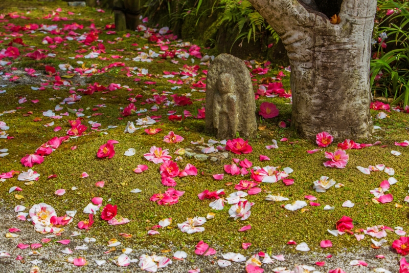 白毫寺には樹齢約400年と言われる椿の木が存在します。赤や白だけでなく紅白斑模様になった椿など、色とりどりの美しい椿が境内を彩ります。この「五色椿」は、東大寺開山堂の「糊こぼし」伝香寺の「武士椿」と並んで「奈良三名椿」と呼ばれています。