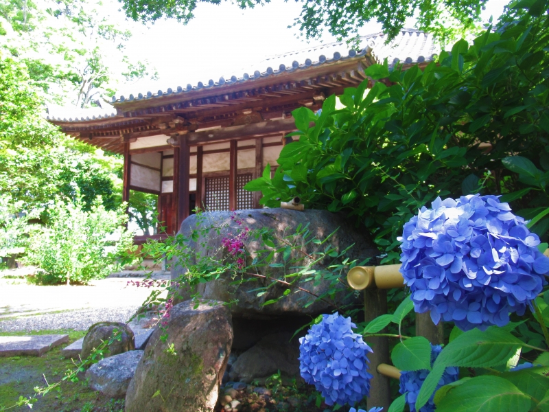 梅雨前の時期には紫陽花が咲き誇ります。紫陽花に特化している寺院と比べるとさすがに劣りますが、梅雨の薄暗い時期に咲く青紫・赤紫の紫陽花は参拝者の心を癒やしてくれます。