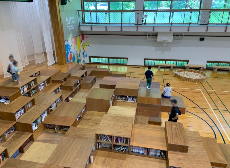 旧体育館には、木材を使った迷路や階段状の本棚もあるので、お子さんが退屈した際にも安心です。その他、雑貨店3COINS(スリーコインズ)のミニショップ、工芸品のギャラリーもあるので、ゆっくりと過ごしてみてください。
