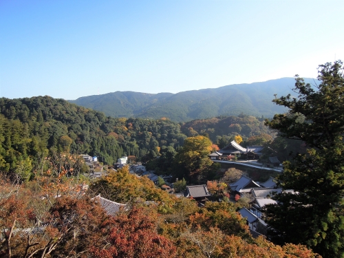 五重塔は、昭和29年に建てられました。鮮やかな朱色の塔身、金色の相輪、檜皮葺の屋根が、山中の景色に調和しており、昭和の名塔と呼ばれています。近くからじっくり眺めるのも良いのですが、本堂の舞台から眺めると、山の景色に溶け込んでおり、また違った趣があります。