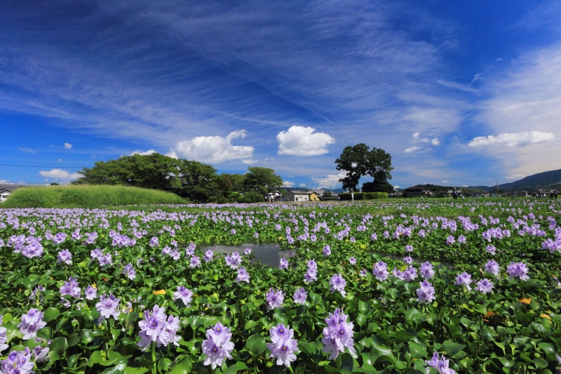 橿原神宮から車で10分ほどの距離にある「本薬師寺跡」では、毎年夏から秋にかけて水草の一種であるホテイアオイが花を咲かせます。その花の数はなんと40万株!例年8月末〜9月頃に見頃を迎え、水田一面に紫のホテイアオイが咲く様子は壮観です。周辺には彼岸花も咲き、紫のホテイアオイと真っ赤な彼岸花のコラボ風景を楽しめますよ。