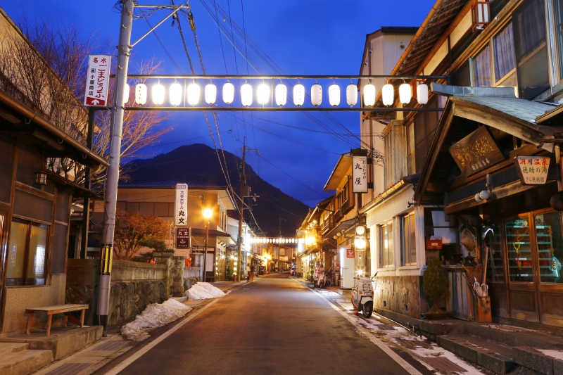 温泉街は夜になると提灯に灯りがともり、とても良い雰囲気です。静けさの音がしそうなほどしんとした温泉街は、夏には見られない景色です。