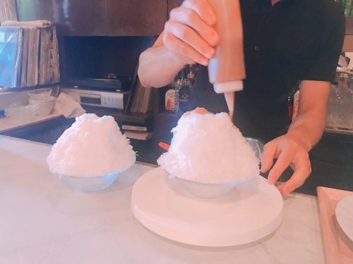 まずは器の半分くらいまでに乗せたかき氷の上に、カスタードクリーム(カスタードプリン)が載せられ、さらにてんこ盛りになるようかき氷をかぶせます。その上には特製のキャラメルソースをトッピング。