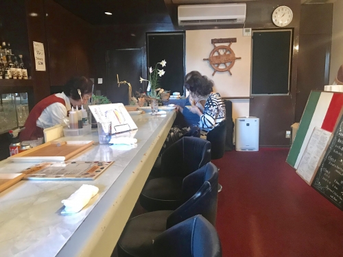 店内は約15名くらい入るような小さなバーで、カウンター席と、テーブル席があります。バーなのでお酒をメインに扱っていますが、ペペロンチーノやピッツァなどのごはんメニューもおいてありますよ(各800円~)。