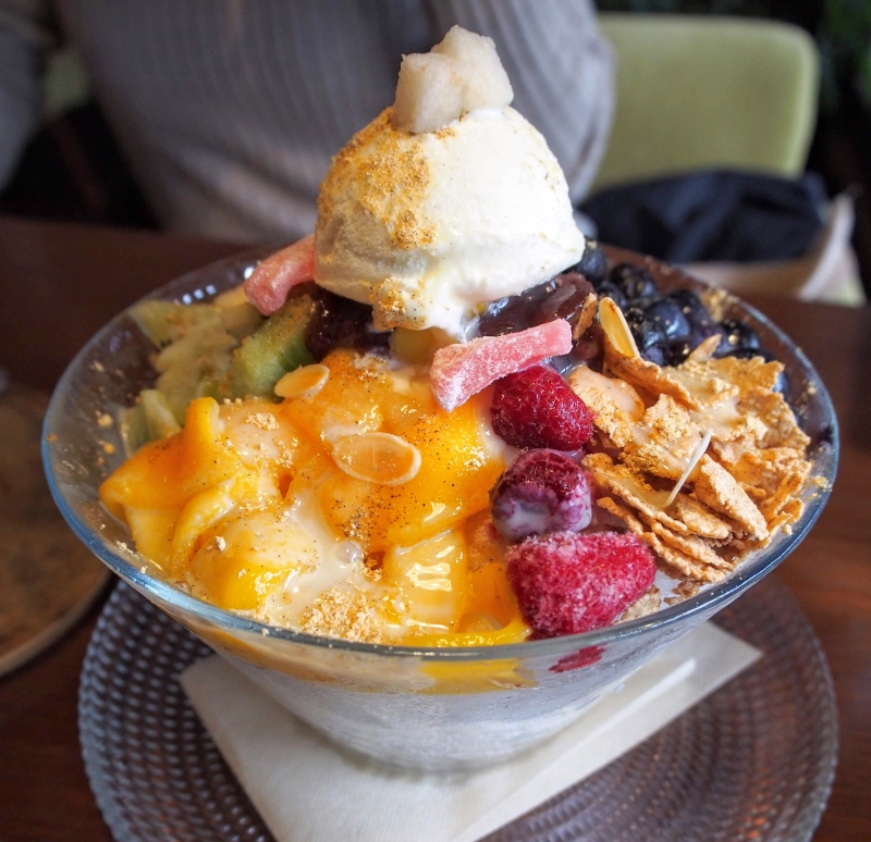 パッピンスにトッピングされるフルーツは奈良産いちごやメロンに桃など、季節ごとにその時一番おいしい果物がミルクベースのかき氷の上にたっぷりのっています。パフェのような見た目の美しいかき氷ですが、食べるときはしっかり混ぜて食べるのがおすすめです。
