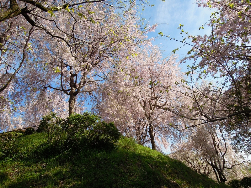 こちらは、展望台下のコンクリート舗装された遊歩道から見た桜です。細い枝にびっしりと花を咲かせたしだれ桜を下から見上げると、その迫力と美しさに圧倒されそうです。