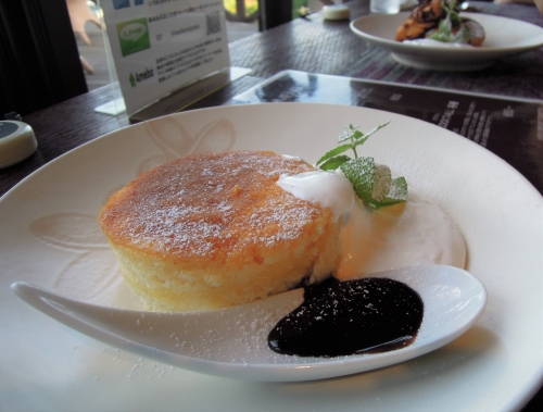 • 写真:ゆきたかふわふわでしっとりとした食感のパンケーキ。生クリームが添えられている。