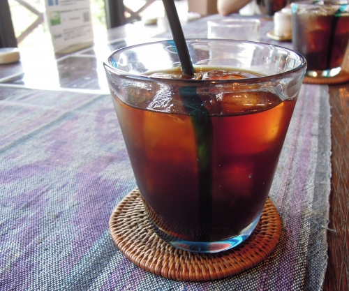 • 写真:ゆきたか陶器のタンブラーで提供されるアイスコーヒー。お店の豆菓子、せんべいも付いている。