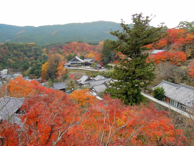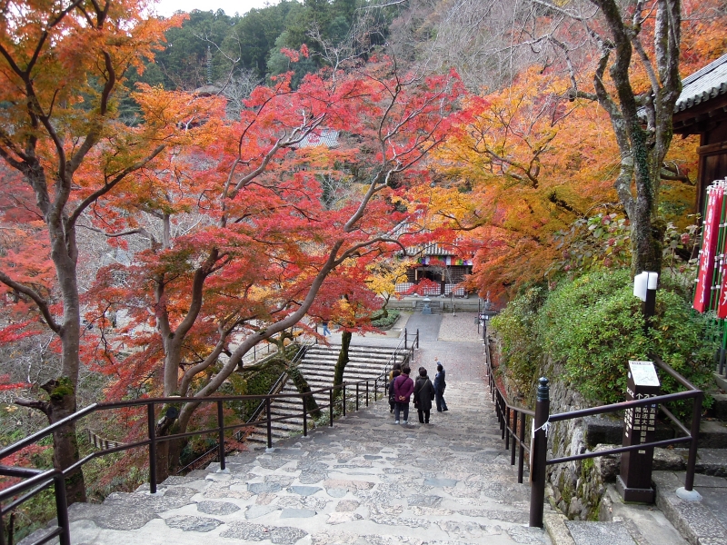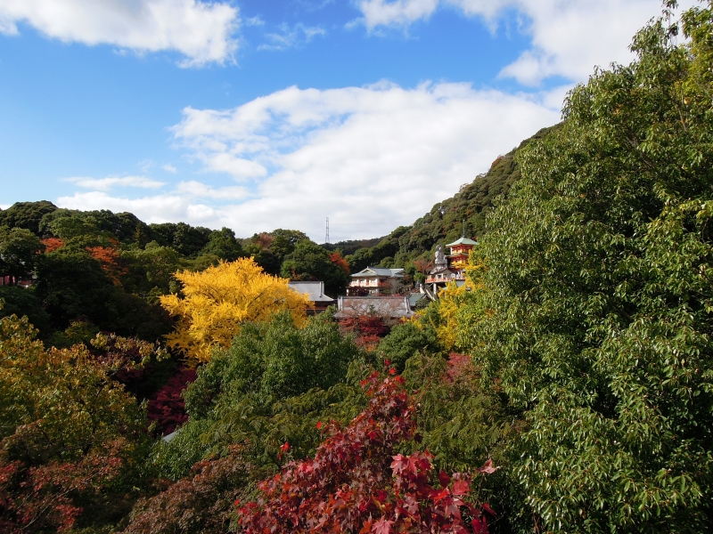 境内各所で楽しめますが、特に本堂の舞台から眺める紅葉は素晴らしいです。眼下に見える門前町と、真っ赤に色付いた山々が同時に眺められます。