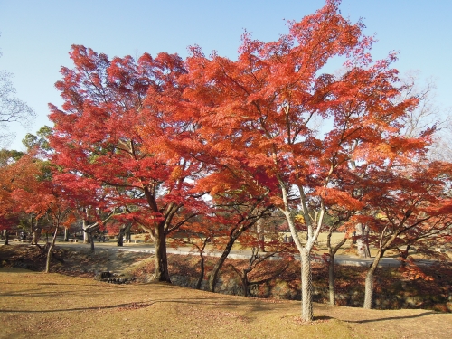 奈良市にある奈良公園では、11月中旬から12月上旬頃まで園内各所で紅葉が楽しめます。その中でも特におすすめのスポットは、浮雲園地と春日野園地の間にある吉城川(よしきがわ)です。川沿いのモミジが一斉に赤く染まる景色は素晴らしく、奈良公園で一番の紅葉名所として知られています。