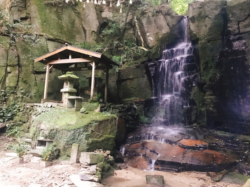 そうして3分ほど登ると、青葉の滝に到着します!緑の木漏れ日の隙間から階段状になった岩に降り注ぐ水しぶきがとても神秘的です。昔は修業の場としても使用されていたことも納得のロケーション。