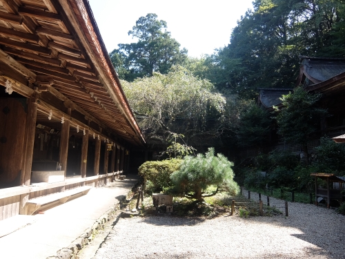社殿は豊臣秀頼によって再建されたものです。中庭を囲みコの字型に配置されており、境内を入って正面に幣殿、左側に拝殿、右側に本殿となっています。
