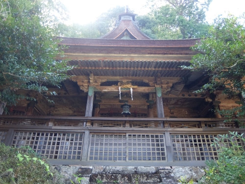 奥千本の中にある小さな神社。境内の中を大峯奥駆道が通っており、修行門と書かれた門から境内へ続く参道は急勾配の坂道です。吉野山の地主神である金山毘古命(かなやまひこのみこと)を祭神として祀っています。