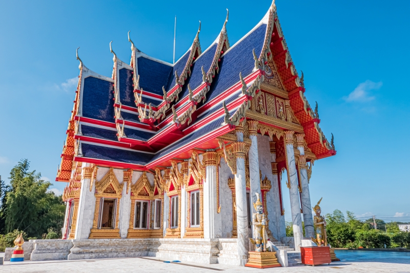 バンコクにあるお寺の別院で、周りには畑が広がる中に突如現れます。カラフルな外観はまさにタイのお寺で、外観だけでなく内観も煌びやか。拝観料はなく自由に見学でき、気軽に暇つぶしに立ち寄れます。敷地内の庭園までもタイそのものです。