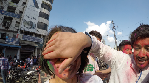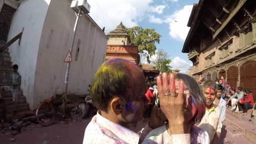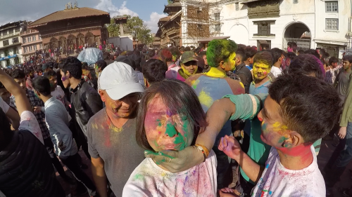 カトマンズの中心街、タメル地区でもお祭りの日はほとんどのお店がクローズしていて閑散としています。通りを歩いていると、カラフルな粉を体に塗りまくった人達が歩いており、「ハッピー ホーリー!!」と言って、他人に色粉を塗っていきます。また所々で大音量の音楽をかけて、踊りまくってる人達がいたりもします。