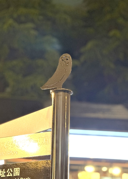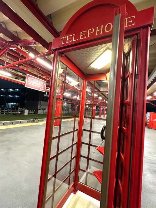 西武豊島園駅 駅前広場も、ハリーポッターの世界が広がっています。サインポールの上には、ふくろうが。ホームと同じ、としまえんで使用されていた電話ボックスもあります。