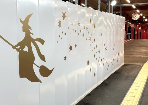 ホームにある赤いレトロな街灯も魔法の世界を演出。夜はより雰囲気がでています。自販機も赤く装飾され、統一感のあるホームになっています。