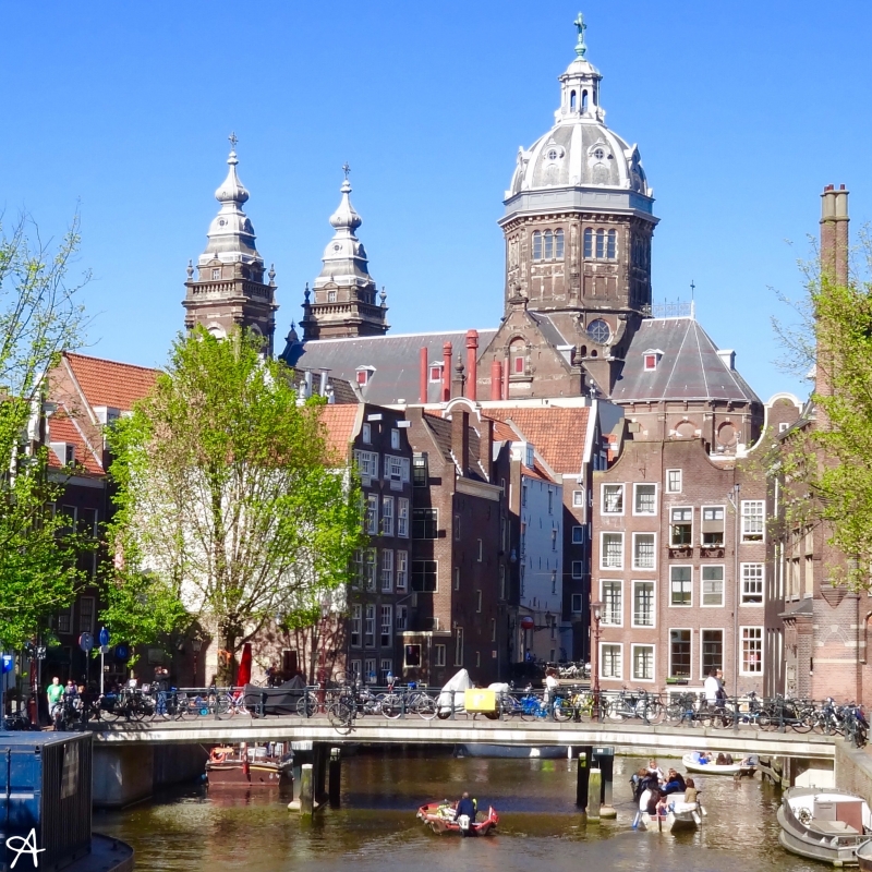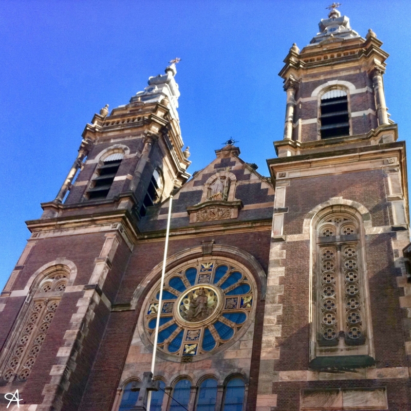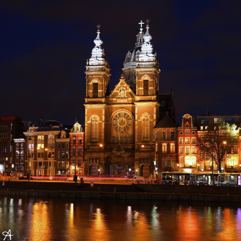 アムステルダム中央駅から南側に歩いていくと、すぐにフォトジェニックな教会が現れます。日中もいいですが、夜はライトアップされて、より荘厳な雰囲気が漂います。