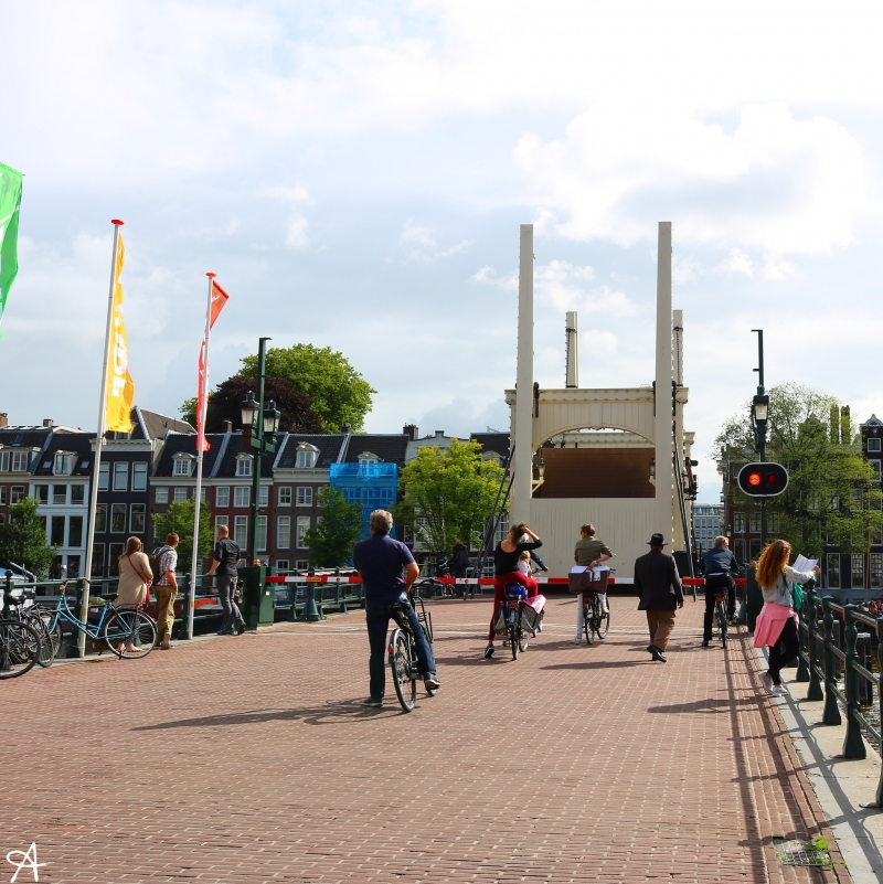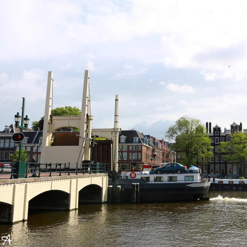 アムステル川にかかる橋で、アムステルダム唯一の跳ね橋です。開閉は不定期のようです。一度閉まると船が通り終わるまで閉まったままになり、数分間待つことになりますが、皆のんびりと待っています。開閉するところを見られなかったとしても、アムステル川は比較的川幅が広く、細い運河とはまた違った雰囲気を楽しむことができます。