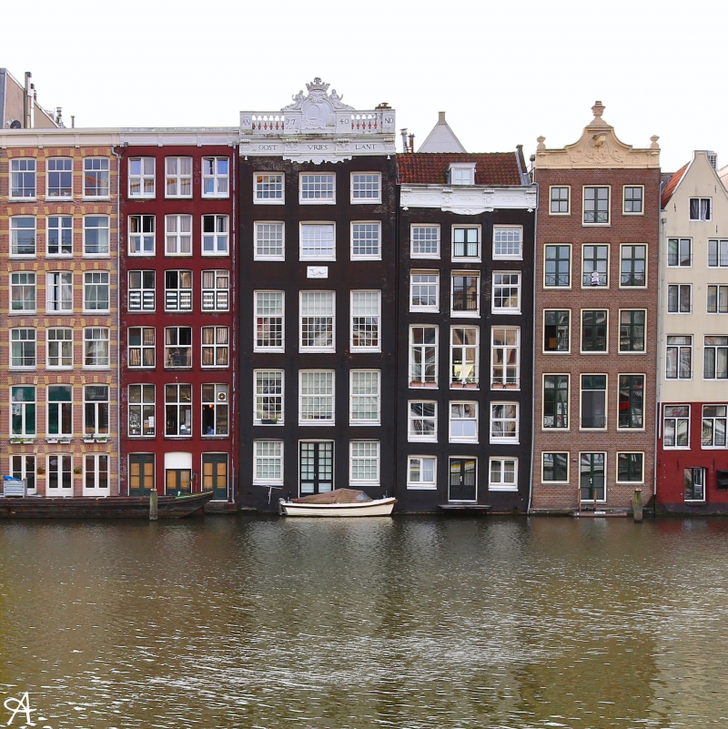 この写真は、アムステルダム中央駅からDamrak(ダムラク通り)を南西方向に歩いて行くと見えて来る船着場で撮りました。