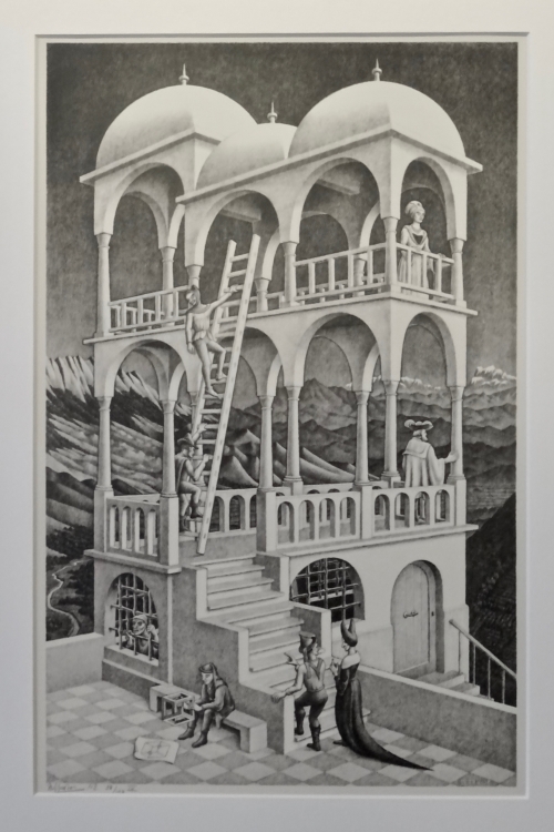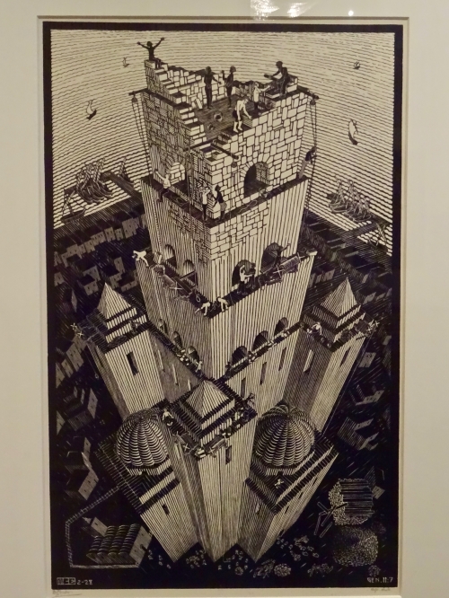 『物見の塔』はネッカーの立方体錯視を応用した作品の一つですね。現実にはあり得ない建築物ですが、つい観入ってしまいます。