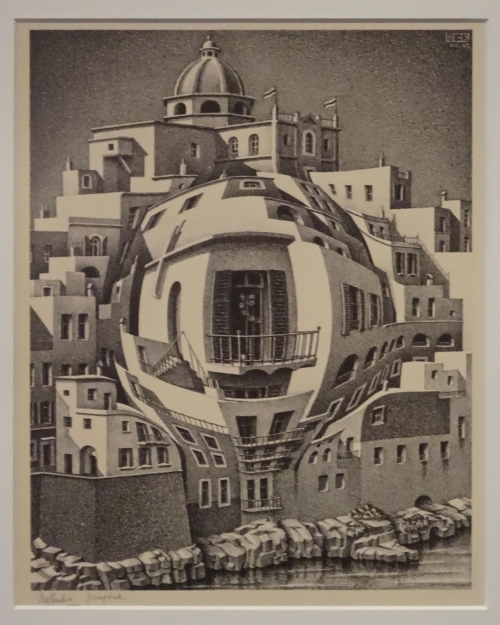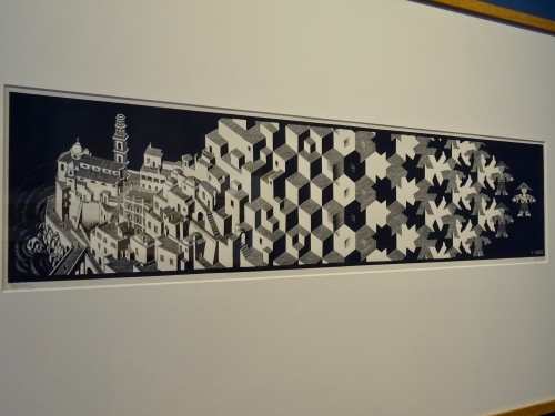 美術館の2階には、これぞエッシャーと言えるだまし絵や幾何学的な作品を展示しています。彼は1935年以降になると、このような錯視を取り入れた作品を創り出しました。
