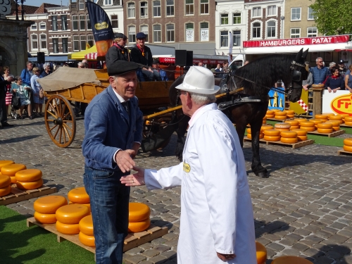 会場となるゴーダのマルクト広場には、チーズを運ぶ馬車やチーズガール、チーズ商人達が勢揃いしており、午前10時になると市庁舎にある鐘が鳴らされチーズ市場の開催を告げます。会場ではアナウンサーが英語も用いて、ゴーダの街やチーズ市場についての説明が随時行われます。