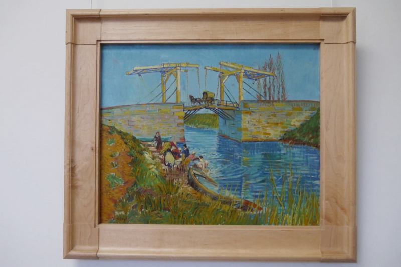 この絵「アルルの跳ね橋」も近寄って見てみましょう。水の動きを表現する筆のタッチ。近寄って水面を見てみると、上手なのか上手じゃないのか素人にはよくわからない描き方です。離れて絵を見なおしてみると、水の透明感と水の動きがよく表現されています。ゴッホはこんなタッチで水の動きを表現していたんですね。感心してしまいます。